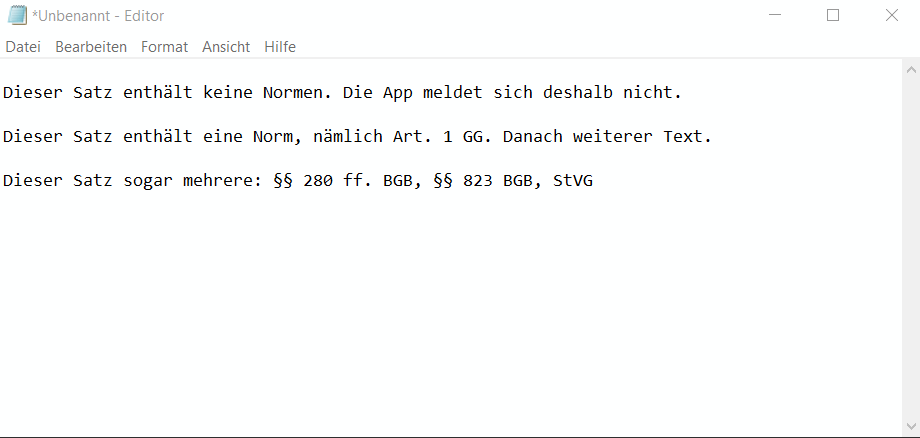 Sobald die App gestartet wurde, können Sie beliebigen Text markieren. Wenn die App darin Normen oder andere Rechtsinformationen entdeckt, meldet sie sich von selbst bei Ihnen. Anderenfalls passiert einfach nichts (Beispiel).